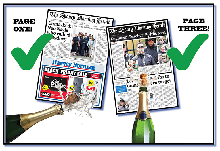 We know, BUGgers, we know! With today’s (Thursday’s) edition of the SMH having a Hardly Normal adverting wraparound, we assume two subs (we’re going to say two because it makes our victory even sweeter) had two stories continued over from the fake SMH cover as coming from PAGE THREE, because that’s where it fucking well came from! Not page 1! Not the front page! Not the cover page.