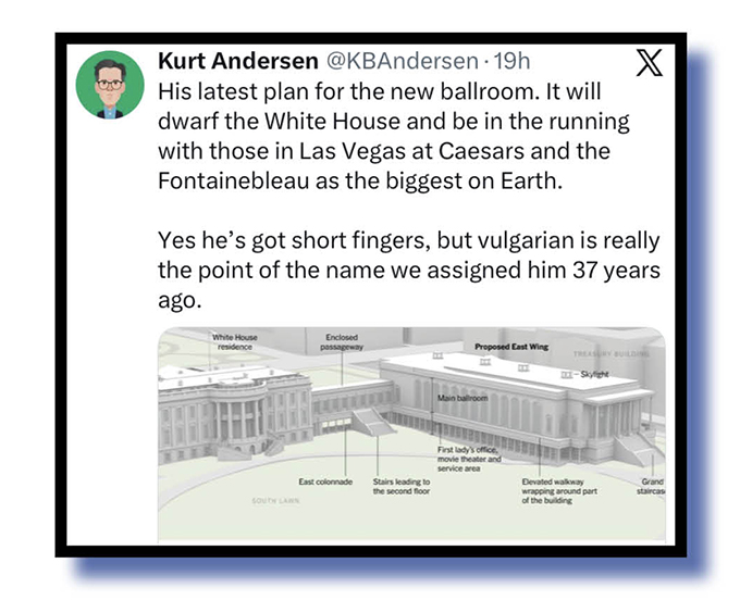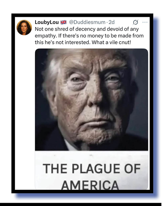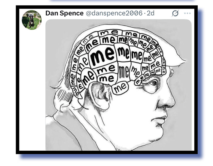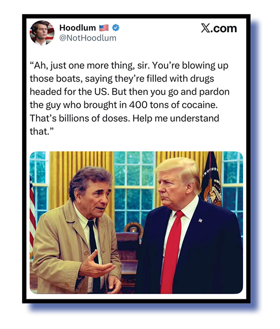 Of course these glimpses into what really makes this dreadful sub-human shitstain tick can vary enormously. The peace-loving Trump’s threat at the weekend that the airspace above and surrounding Venezuela should be considered “closed in its entirety” is a world-stage biggie. He probably put that up on his Truth Social site as he waited impatiently in the rubble of the East Wing for the delivery of the first of many well-deserved Nobel peace baubles.