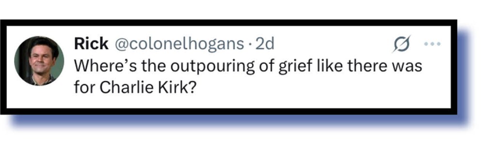 On a more localised scale – but none less damning – was his reaction to being asked if he planned to attend the funeral of that slain National Guard member. You know, that lovely lady that shouldn’t have been on the ground in Washington in the first place until Trump saw some advantage in sending the military into a US city where they don’t belong as he throws red meat to his moronic MAGA base and dreams of a civil war that could keep him in power for quite a while past early 2029. Yes, too long a sentence there. Take a breath before reading on.
