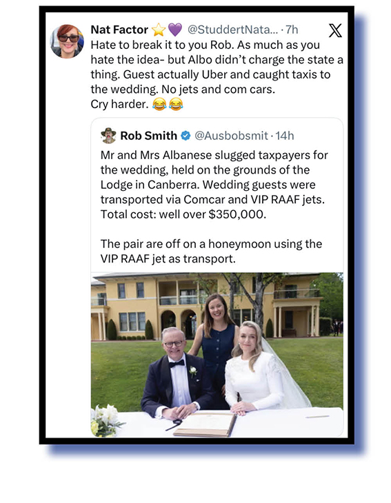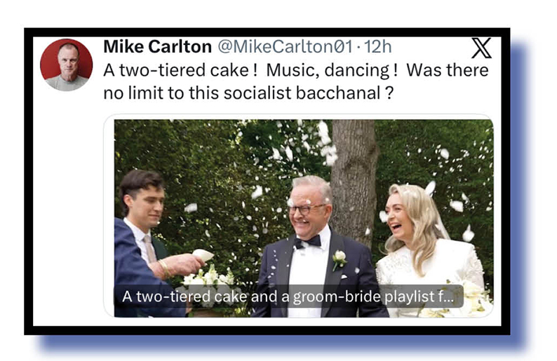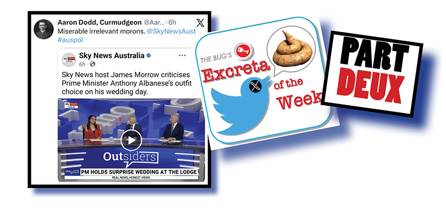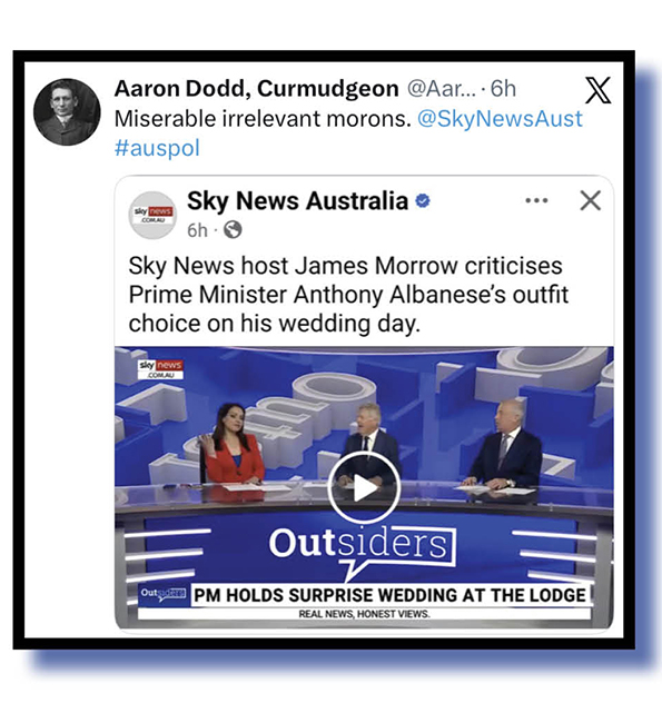 That weekend wedding first, and we’ve highlighted Aaron Dodd, Curmudgeon’s xcretal plop (top and below) over what James Moron – sorry, Morrow – had to say on Sky LNP News about what Prime Minister Anthony Albanese wore to get hitched to Jodie Haydon.