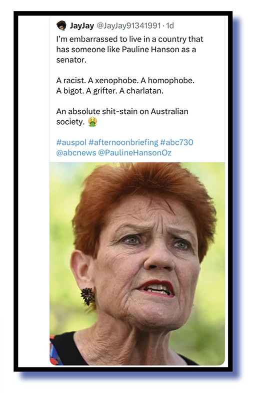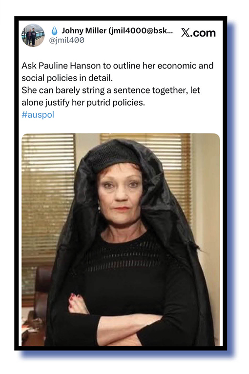 Now, let’s put a fine cloacal coating over the burqued head of Aunty Pauline, the national leader of the white indigenous One Nations people. Here are JayJay and Johny Miller dropping their loads on Aunty “there’s not a racist bone in my body” Pauline.