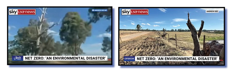 “Our best bet as cynical old washed up hacks is that these photos might not be in the same area, and what the picture on the right depicts may have fuck all to do with transmission lines needed to take wind-and-solar generated power to where it’s needed.