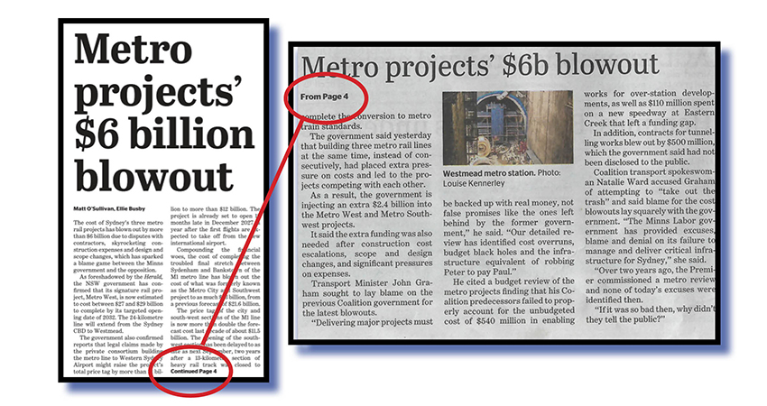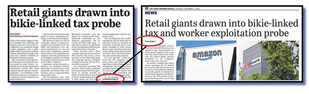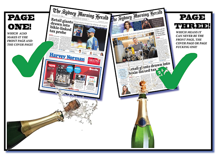 That’s right. For about the fourth Wednesday night shift in a row at the SMH some smart bastard put his sub’s thinking cap on and got it right: a story that flowed over from page 3 – the fake front cover at right in the top image – actually came from PAGE THREE!