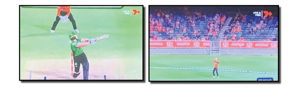 This offering from the TV commentator after a batswoman belted a ball high on to the legside (top left) only to be caught (top right) by a fielder lucky enough not to fall asleep as she waited for the ball to drop from the heavens above: “It’s always hard to keep it on the ground when it goes so high.”