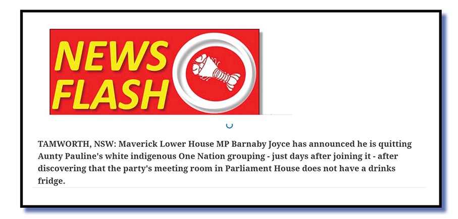A furious Auntie Pauline, national leader of the White Indigenous One Nation peoples, has berated The Bug this morning over its news flash posted yesterday that Barnaby Joyce had quit her party after only a few days as a member and future NSW Senate candidate.