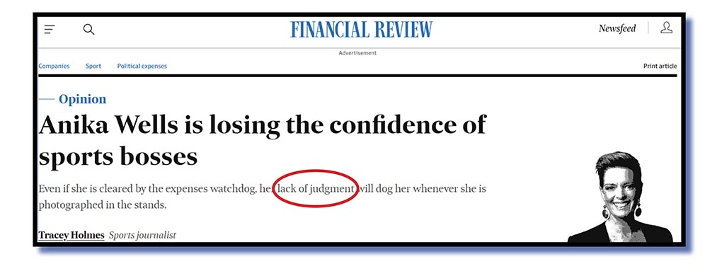 In what was largely a repeat performance of the words she used for a Fin. Review piece mid week, she did hint at these sports jocks’ disappointment over her performance as sports minister but make no mistake: the general thrust of both her radio and newspaper efforts was that Wells was more or less finished as sports minister for expensive family reunions on a snowfield and clocking up a $1000 bill for a Comcar left waiting for some hours as she had fun mixing with sporting people and seeking out a photo op.