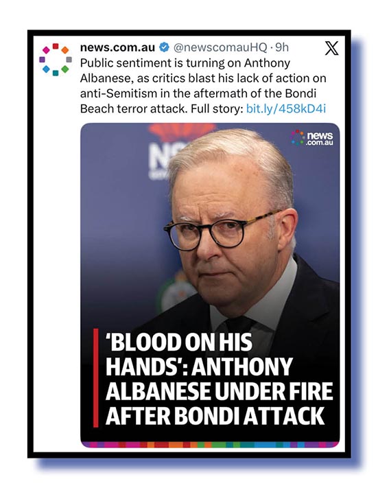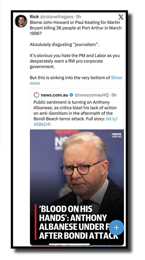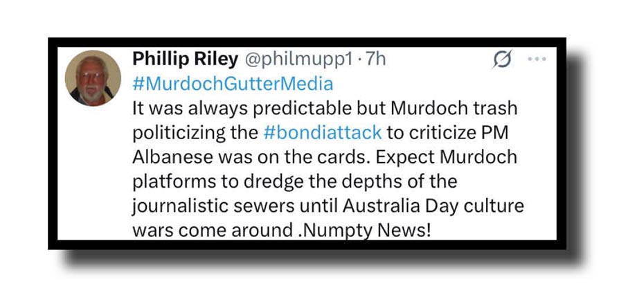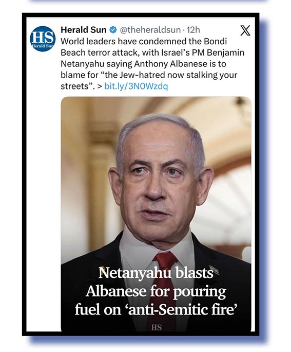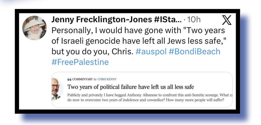 Lovely putdown of Newscorpse’s Chris Kenny that ticked the two boxes we’re looking at today. The mainstream mediocre’s response to the dreadful events in Sydney on Sunday, and cloacal cleansings from Xers on where the blame should lie for the anti-semitism supposedly raging around the globe right now and and putting all Jews in danger.