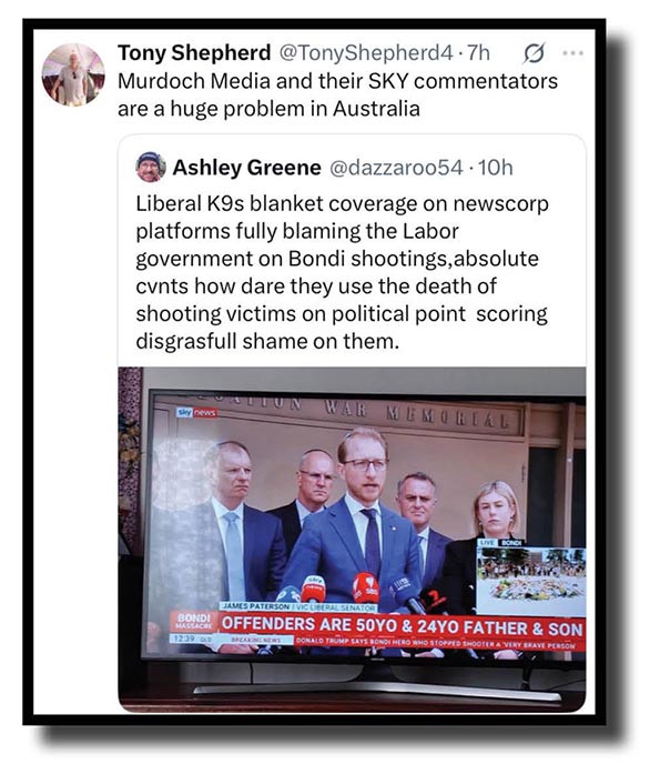 And before we begin, let’s make it clear from the start that we have no time whatsoever for the cowardly crazed cunts who killed all those innocent people at Bondi. We’re glad the dad’s dead and we hope his son survives and spends many, many, years taking it up the arse without the vas in maximum security prison. You mongrel, stupid, moronic, lowlifes! Even if it turns out you lost family in Israel’s genocide in Gaza, what you did is just unspeakably evil. You should have gone to Israel, snuck into Bibi’s compound and garotted the monster.