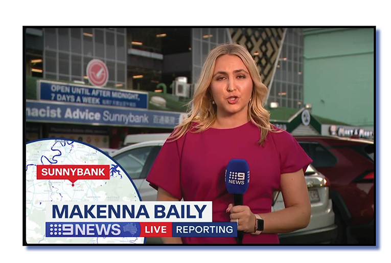 See that imagery at the lower-left corner (above) of a report on Nine News Queensland last weekend. It strives to convince us that Makenna Baily is on location in Sunnybank on Brisbane’s southside. A sign behind her is another clue.