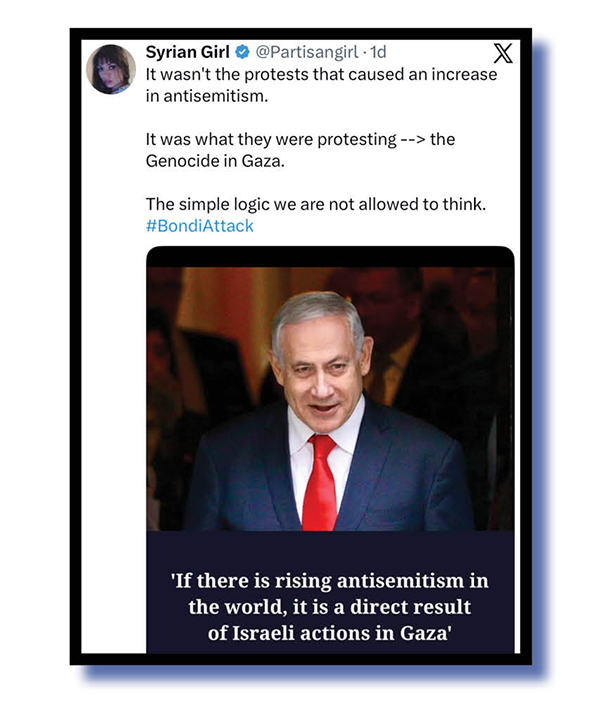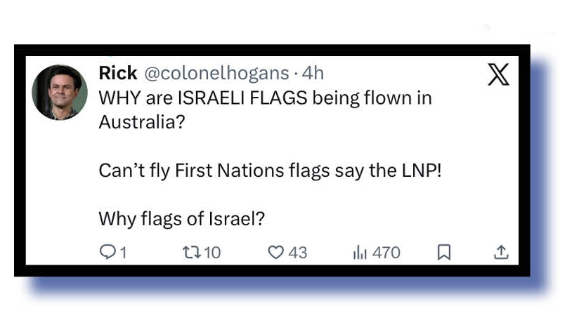 Let’s now restart with Xers pointing their anal anger at Israeli prime minister Benjamin Netanyahu for the world-rise in anti-semitism these past 27 months. And can we at The Bug endorse that 100 per cent. We’ve been very clear through hundreds of posts since October 7, 2023, that the destruction of Gaza and the murder of many tens of thousands of innocent Gazans, including more than 20,000 kids, had fuck all to do with a supposedly professional Israel Defence Force, one of the world’s largest military, trying to root out 20,000 totally overpowered Hamas fighters largely hiding in tunnels.