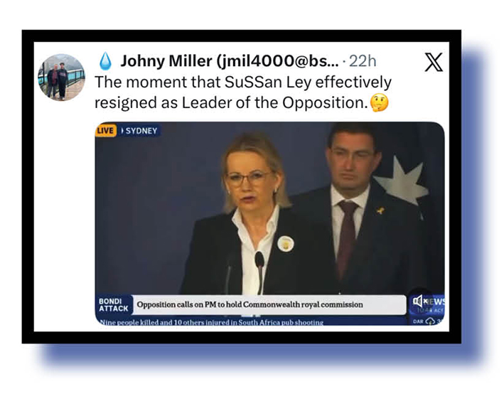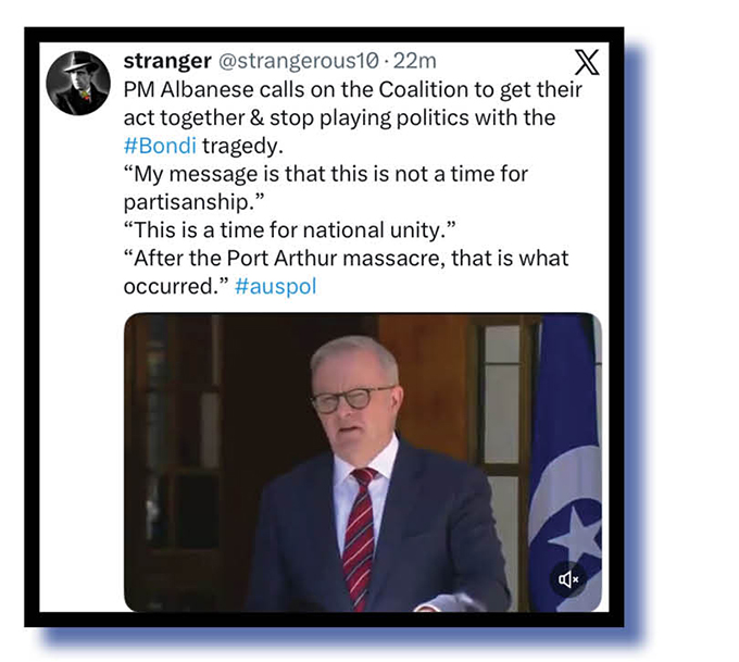 This final look at our Xcrements-of-the-Week concentrates once more on the massive pile-on of Prime Minister Anthony Albanese from the federal opposition, our woeful mainstream mediocre and Jewish Zionists (is that a tautology?) since last Sunday week’s Bondi Beach mass murders and last Sunday’s vigil.
