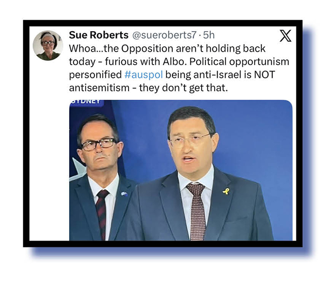 stranger and Sue Roberts focused on the Opposition’s disgraceful decision to play politics on the Bondi tragedy. Such desperation from the voter-deprived.