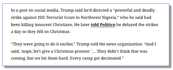 Mr Hegseth had called the news conference to outline the decision by the Trump administration to launch missile attacks by US drones and US Navy missiles on alleged ISIS terrorist camps in north-west Nigeria. (below)