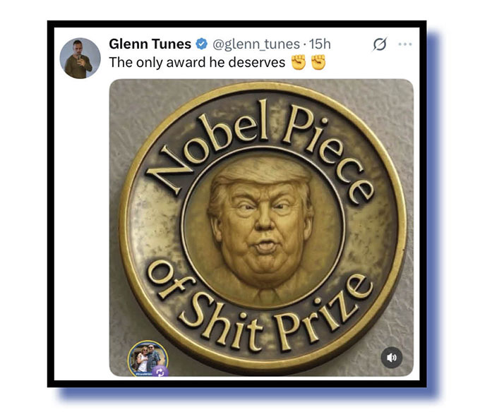 Let’s say hello first to Donald Trump. Our xcrement judges couldn’t go past the wonderful meme (at top and below) from Glenn Tunes.