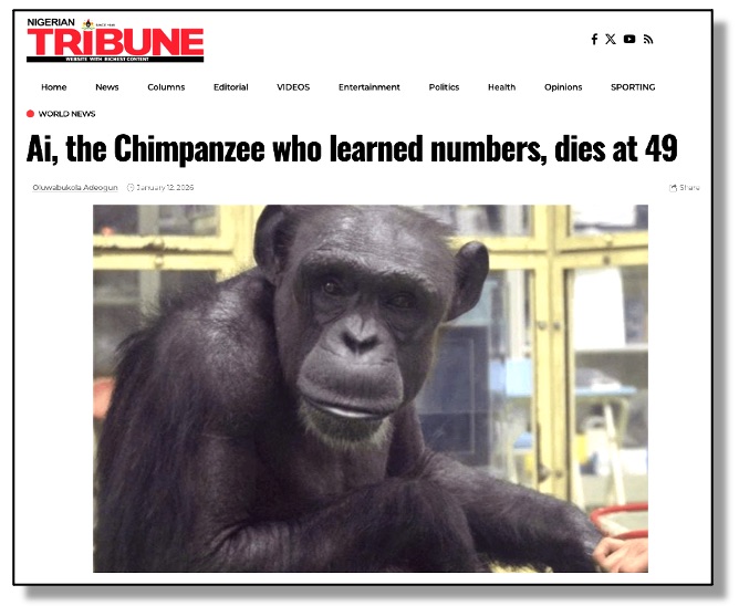 The animal research world is in mourning following the death in Japan of Ai, the 49-year-old female chimpanzee famous for her cognitive skills. (below)