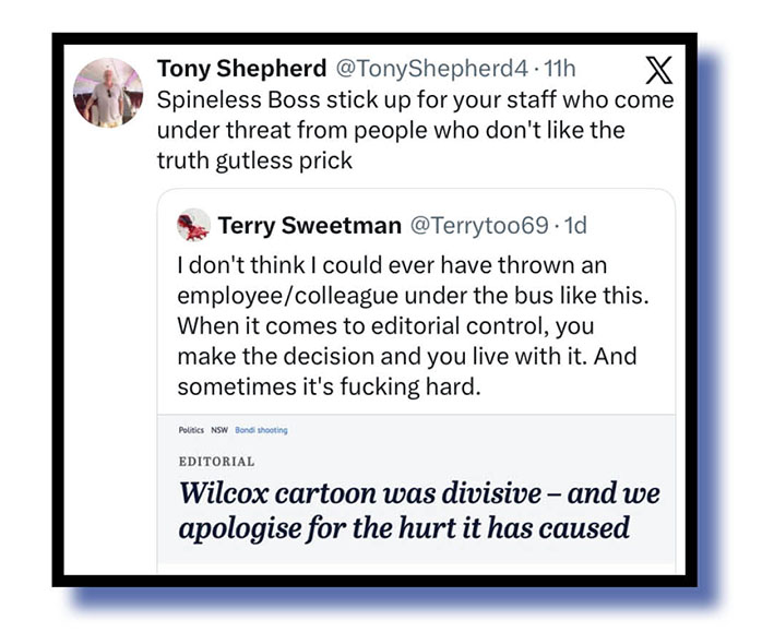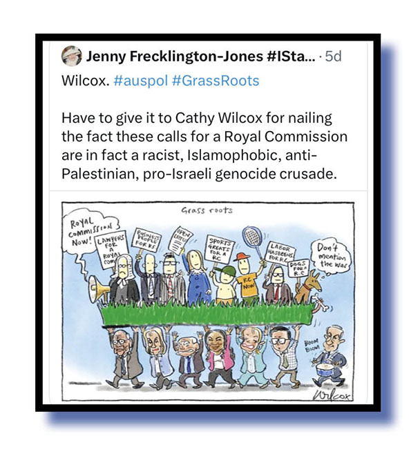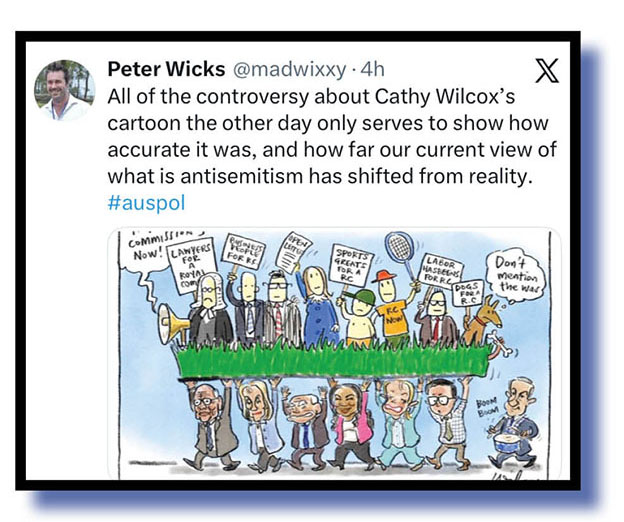 Shit, Cathy! We may be silly old sausages here at the MGH but that surely was the point of your cartoon. We’ve got no doubt whatsoever that the beating of the anti-semitic drum over the Bondi Beach massacre was a shameful politicisation of that tragedy, egged on by Newscorpse but not, apparently, by a fair and balanced Nine Entertainment Co. publication. And we believe that a vast majority of Aussies – and a more than a fair share of our Jewish community – would agree. We wouldn’t dare imply all of that community now, would we?
