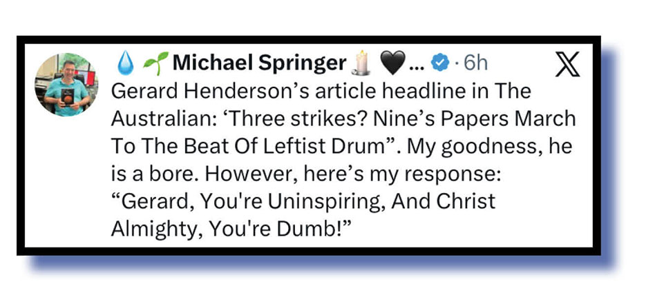 Michael Springer appears to have little time for Gerard “The ABC must be sold immediately to the Murdochs” Henderson, slsandpet drops their own load and we have no problem at all with Adam Houda having a very sensible conversation with himself.
