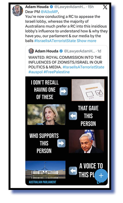 Or as one of our more colourful compilers put it: “Some right-wing flag stealers and others who have shown their total distain for Muslims and their faith should go fuck themselves with a garden hose! And then hand it over to the likes of Tim “Proudly Zionist” Wilson, Josh “I feel some votes coming my way; where’s my yarmulke” ” Frydenberg and Australia’s anti-semitism envoy Jillian “any criticism of Israel is by its very nature anti-semitic” Segal .