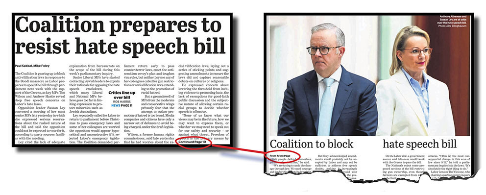 Okay, so far so good. But here’s where it gets tricky! The following image is of yesterday’s (Thursday’s) edition of the SMH where the production powers-that-be decided to call what you can see below page 1. So hands, ready! Which of the descriptions below accurately reflect that decision?