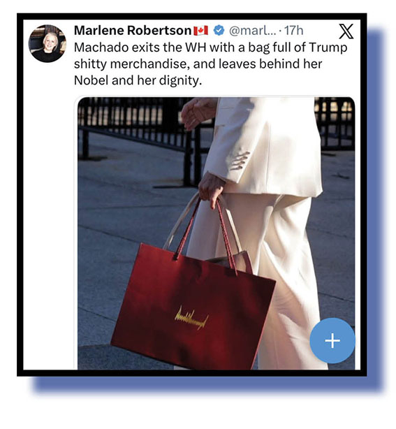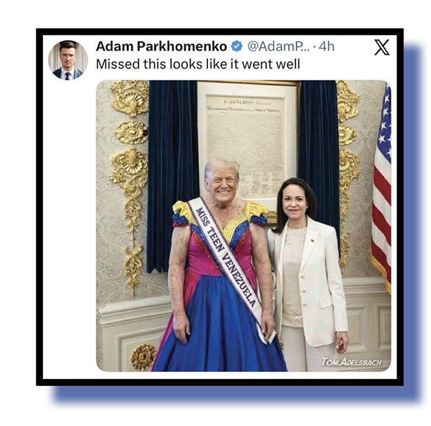 Marlene Robertson and Adam Parkhomenko both strained away on several aspects of Maria Corina Machodo’s cringeworthy visit to what’s left of the White House, Marlene referencing the Trump griftbag she was given, and Adam giving tacit approval to the pretty dress and sash that Machado won when she claimed the Miss Teen Venezuela title back a while.