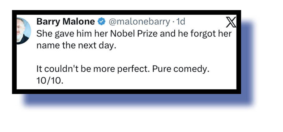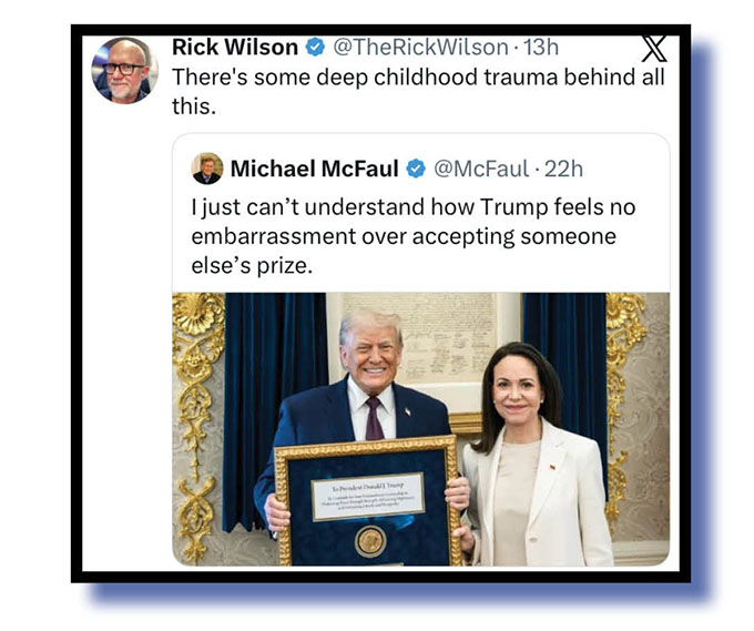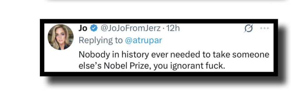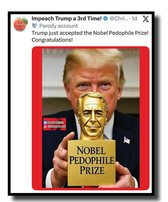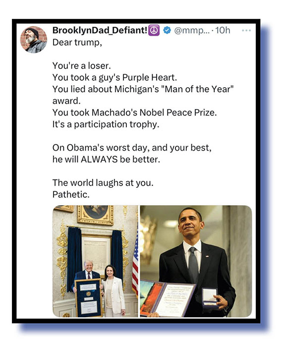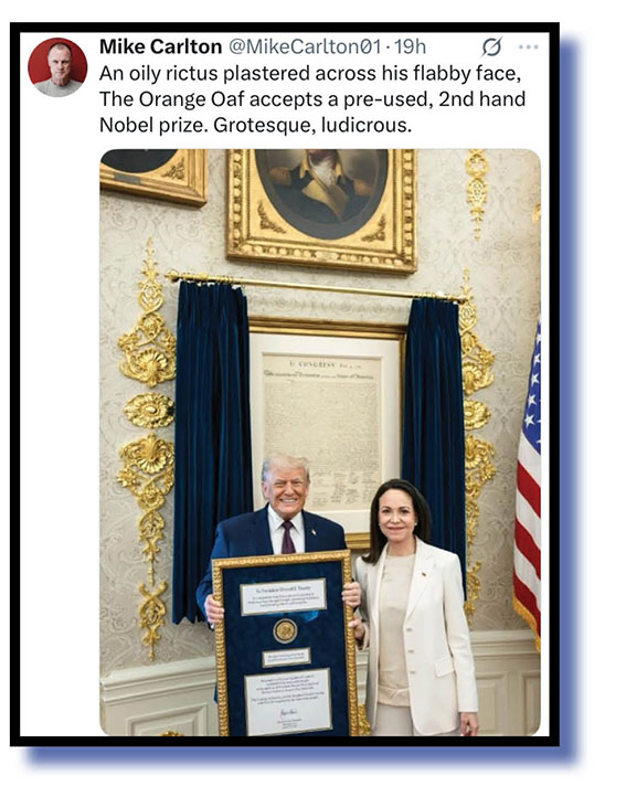 Which means this second look at our Xcrements-of-the-Week concentres once more on Yam Tits/Orange Mussolini/The Tangarine Shitgibbon/Captain Bone Spurs/Demented Donny/Diaper Don/The Moron of Mar-a-Lago/TACOman’s tacky receipt of that Nobel peace prize, his pride at getting it and social mediocre’s rabid and raucous response to it all!