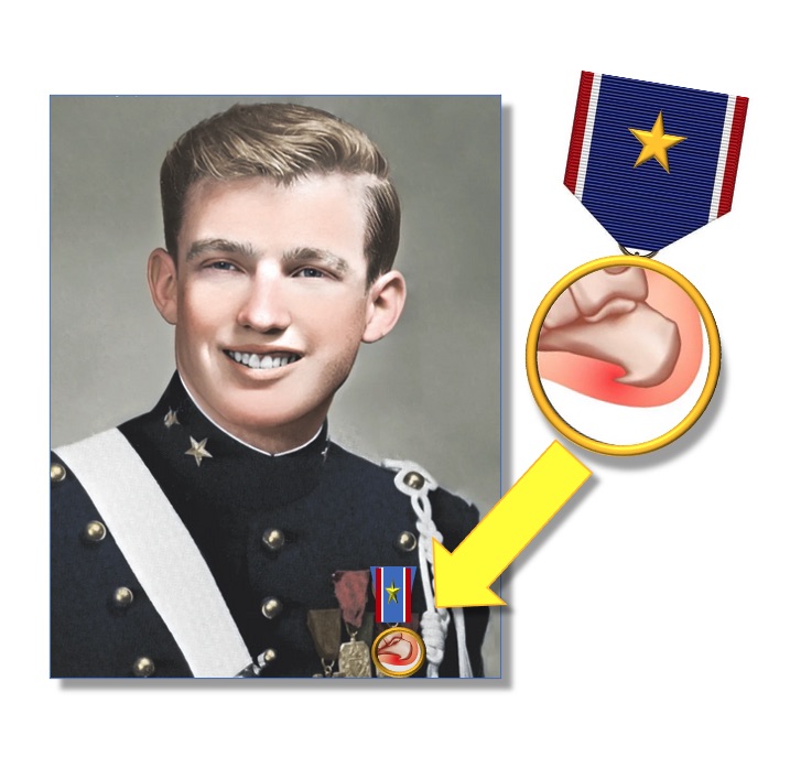 “His bravery and military service in the ROTC was recognised with many, many medals, including one that has only ever been given to one person, namely him, for bravery in the face of bone spurs,” she said while distributing photographic evidence she claimed backed her statement. (main picture)