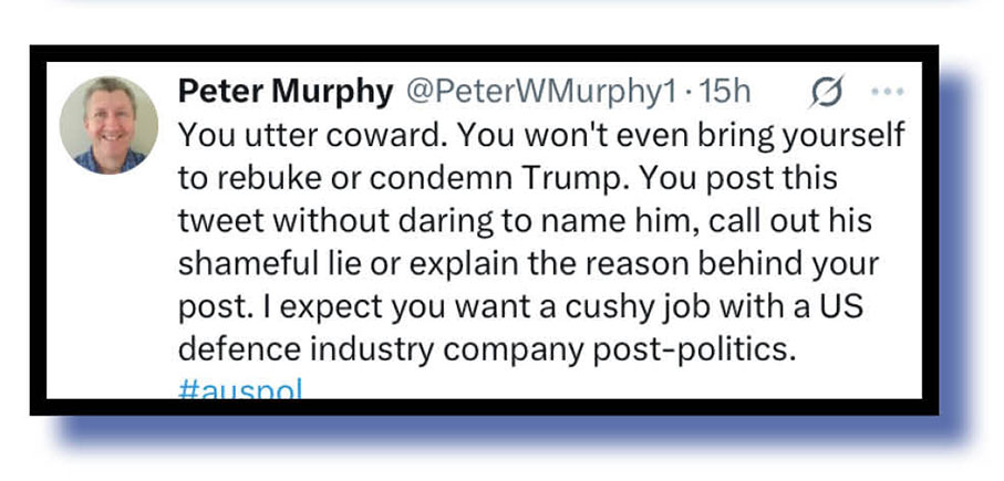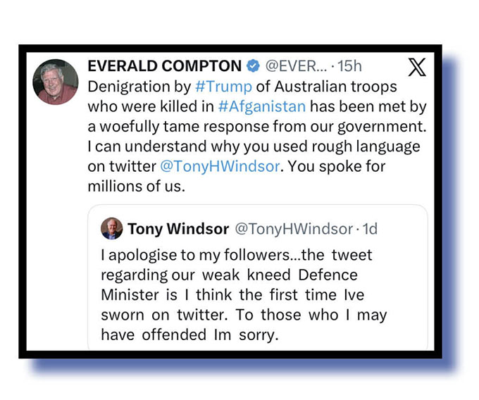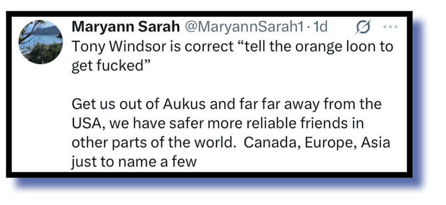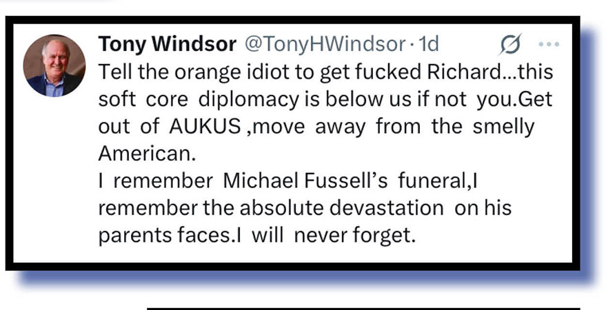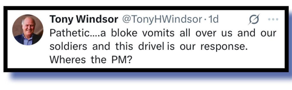 Our judges selected the xcretal offering (top and below) from some chap named Tony Windsor to set the scene as to why so much online faecal flak headed Marles’s way as he clearly firms up a post-politics AUKUS job in the US.