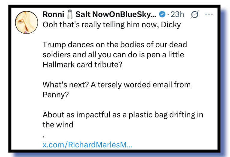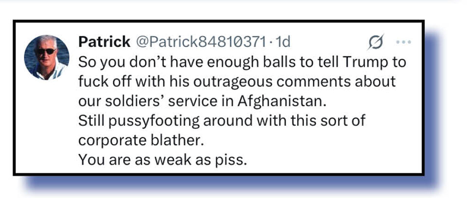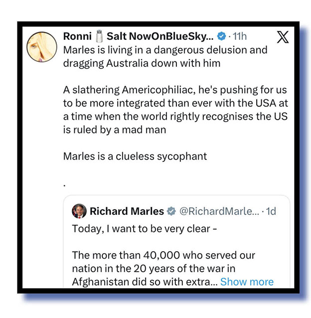 As you see from the bottom of Ronni’s post, a Richard Marles post declaring that, today, he wanted to be very clear about something got Marles covered very quickly in shit. Our Xers were far from impressed with Marles’s simplistic, totally off-target rant about our wonderful defence force personel … well, let’s give Ronni a second blast to explain all the anger his X post created.