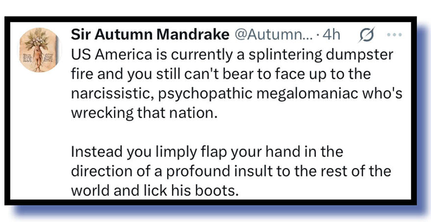 So what’s this chap on about? We’ll let two of our regular Xcreatas clear out their virtual cloacas to explain why we had to empty our putrid Xcrements-of-the-Week barrel three times last week. Take it away, Everald Compton and Ronni Salt NowOnBlueSky.