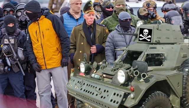 As the agency’s self-titled Oberst-Gruppenführerb, Herr Bovino, (extreme right and centre in main picture) was last seen on the frontline in Minneapolis yesterday about to board what observers believed was a Panzer armoured personnel carrier.