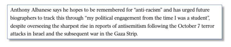 The worst – or should that be best – at this counterproductive malarkey is the national broadshit The Australian, which continues its two-track coverage of the issue of antisemitism with a recent item.