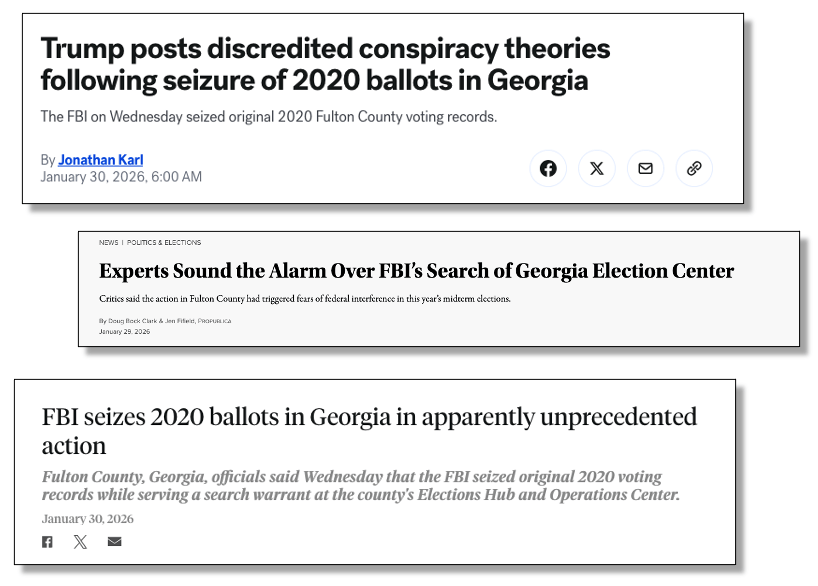Their concerns have been amplified by the most recent news of the incursion by the no-longer-independent FBI in the state of Georgia where they have seized boxes of ballot papers from the 2020 election which they will take away and hold, supposedly to examine them for “evidence” that the presidential election was stolen. (below)