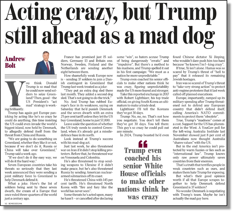 Bolt doesn’t seem to have learned the lesson of the 2025 Australian election at which he and his fellow Righters followed the Murdoch model and backed Peter Dutton as a Trump-lite leader, and look where that got them and News Crap Australia’s Liberal Party franchise.