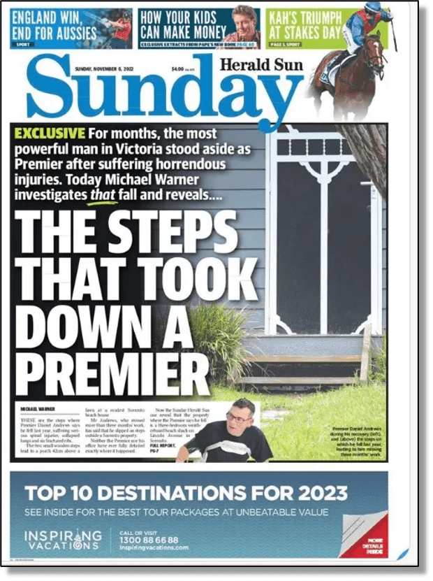 Our London bureau has been alerted to maintain a watch on Heathrow Airport for the no-doubt imminent arrival of the Melbourne Herald-Sun‘s crack shortfall injury investigation team (SHIIT) which the paper established a few years back to get to the bottom of a similar incident involving then Labor premier of Victoria, Dan Andrews. (below)