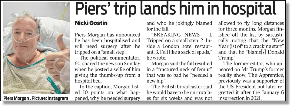 News that over-promoted UK-based loudmouth Piers Morgan had been injured in a tumble down a very short flight of steps (below) caused a ripple of excitement throughout the several floors of The Bug‘s Brisbane headquarters housing our Media Glass House teams.