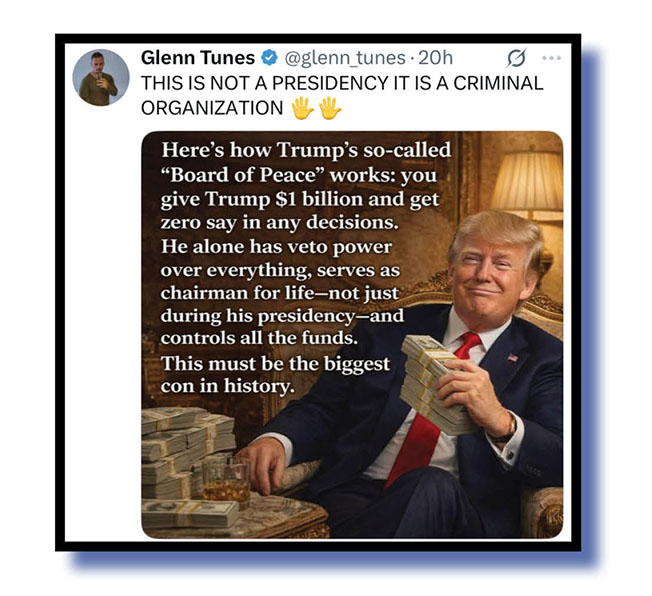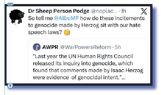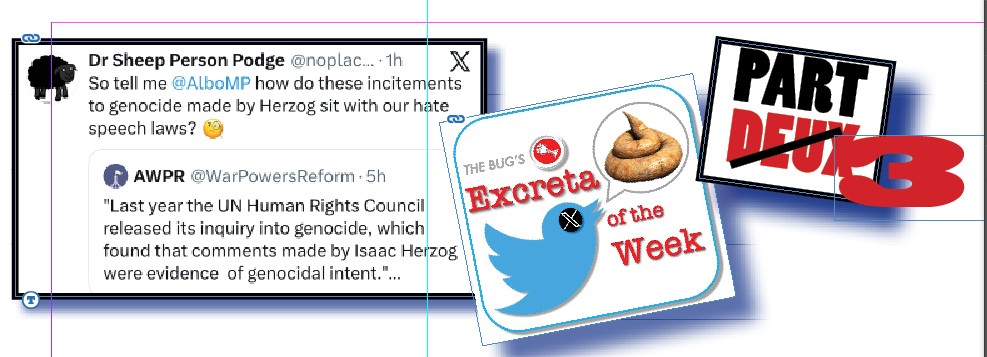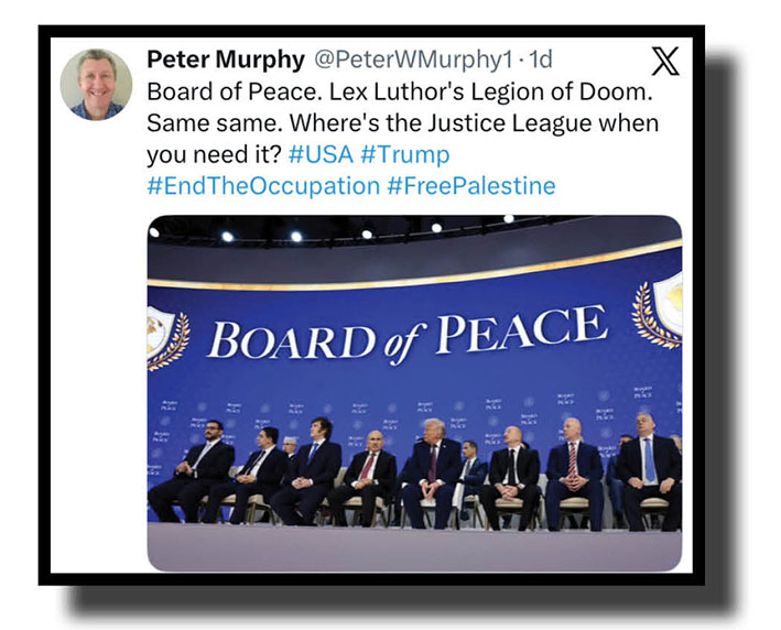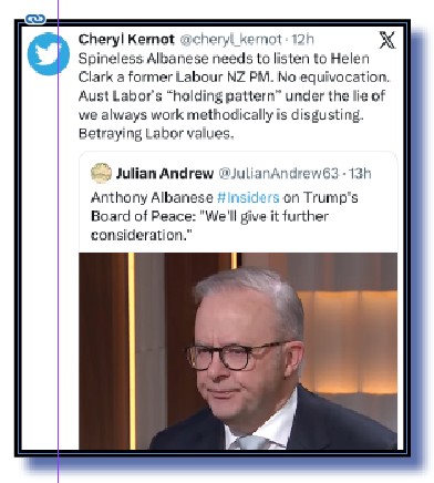 In the meantime, let’s look at the virtual faecal flak that Cheryl Kernot responding to Julian Andrew, Glenn Tunes and Peter Murphy let fly with over Donald Trump’s Board of Peace.