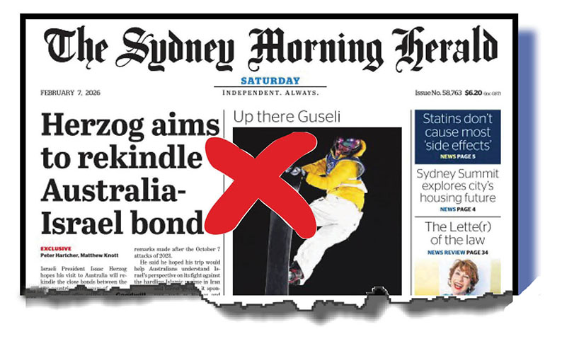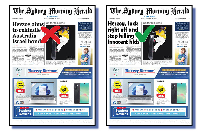 It’s at the left of our main image at top. The one with the big red X next to it. At right is the correct heading any one of the washed-up, tired, old, former subbing hacks who run The Bug and its media review columns would have keyed in – after probably a half-second’s thought to get the four decks all neatly squared away – if they had been on duty at the SMH on Friday night. The one with the green tick of approval.
