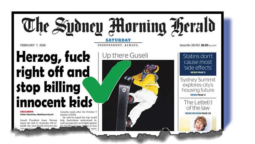 Oh, and would all decent Australians please tone down any bad feelings they might have against this Gaza genocide enthusiast, bomb signer and committed Greater Israel supporter where, seeing a Palestinian state is never, ever, going to happen, Gazans and West Bankers should do the right thing and fuck off now. Please try to forget all that about Herzog and ry to make him feel welcome in the interests of unity and harmony and how nice we Aussies basically are!