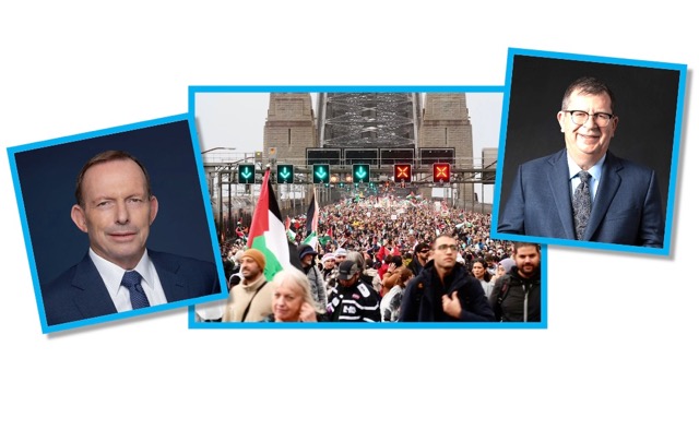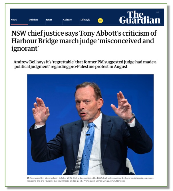 The Judicial Commission of NSW said the complaints followed a speech on Thursday by Chief Justice Bell (at right below) in which he described criticisms by Mr Abbott (far right and at left below) of a judge’s ruling on last year’s anti-genocide pro-Palestinian march across the Sydney Harbour Bridge as “regrettable”, “misconceived”, evidence of an “ignorance” of the law, and “a form of misinformation”.