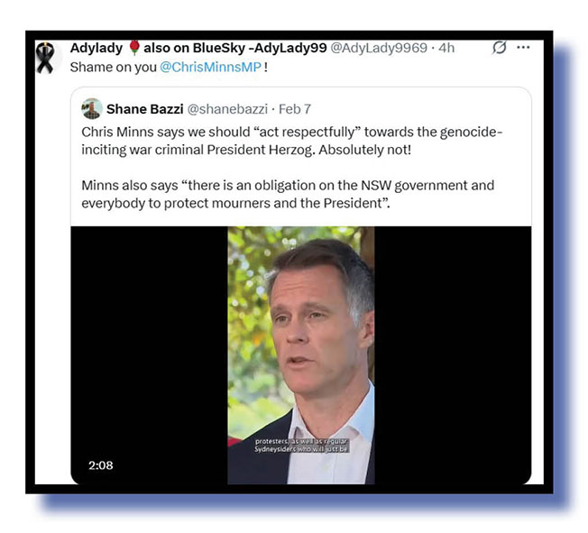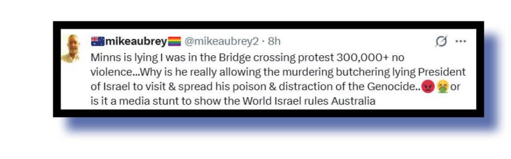 Also calling out Minns’ lies about the conduct of people opposed to Israel’s genocide in Gaza was mikeaubrey….