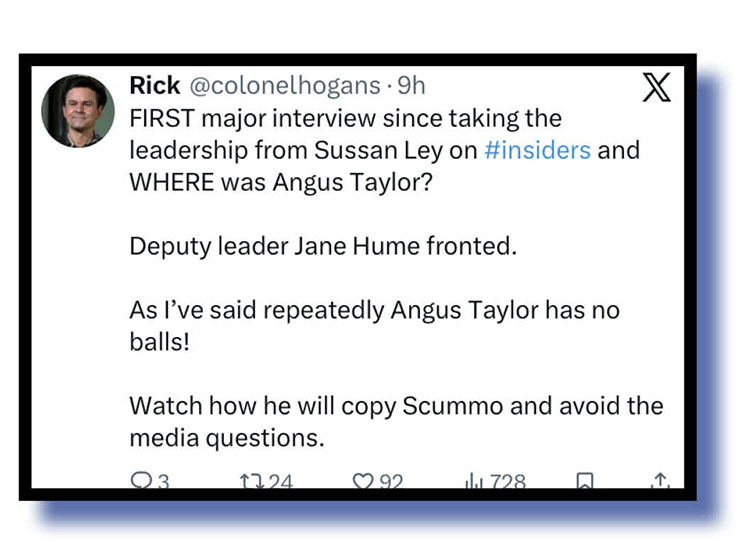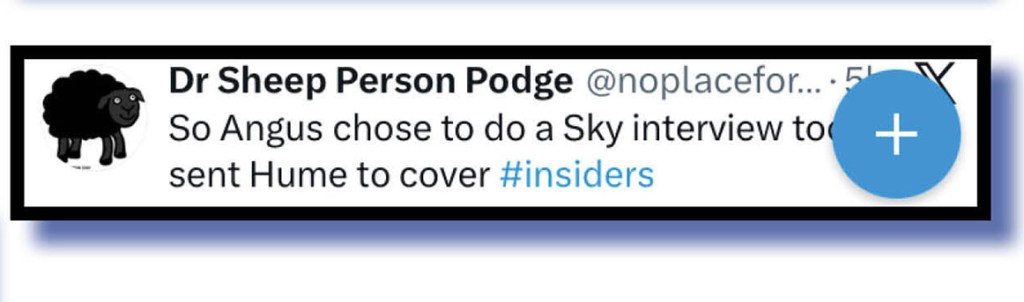 .. and Rick saw a lack of cajones in Taylor’s physical makeup by heading off to Sky LNPNews while sending Hume off to Insiders and the political blowtorch from David Speers. (Joke, people! Settle!). Dr Sheep Person Podge also spotted the lack of courage from Gus while Phillip Riley critiqued how Hume fared on that program.