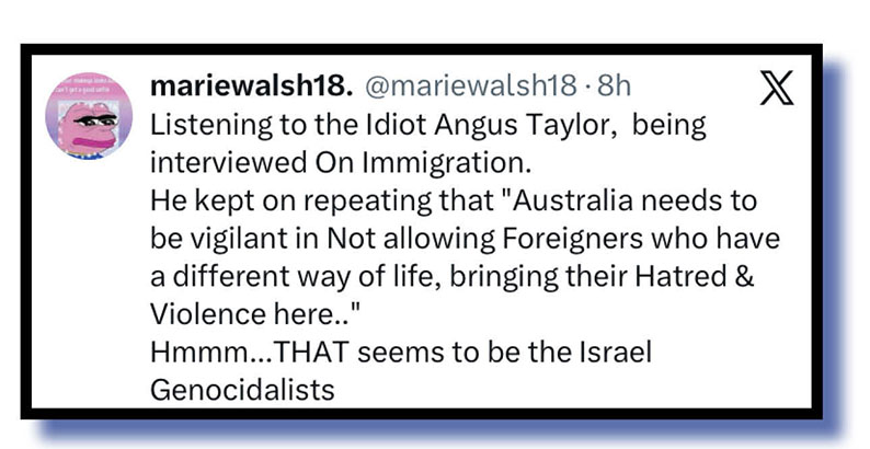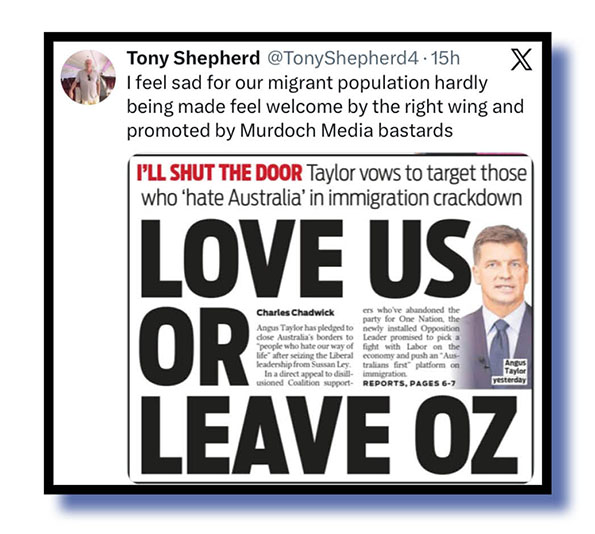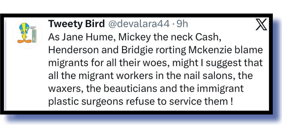 mariewalsh18. and Tweety Bird picked up on the immigrant-bashing line that has John Howard wetting his pants more than normal ….
