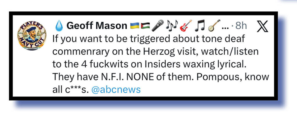 And no XOTW report is complete without someone opening their literal bum bays and dumping on ABC Insiders and its host David Speers, so here are Geoff Mason and BeThin Canberra.