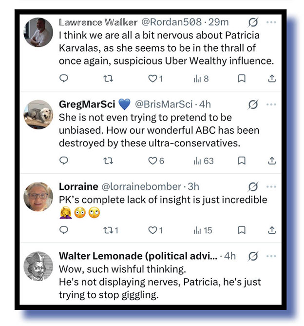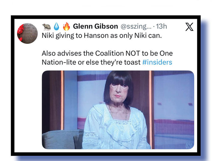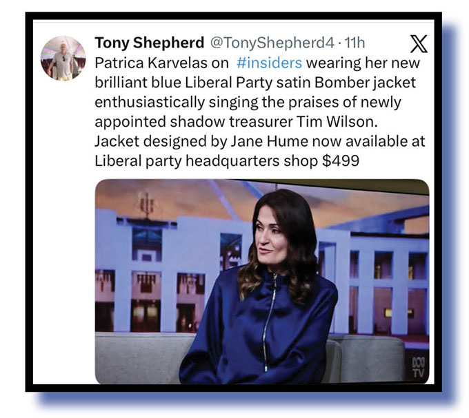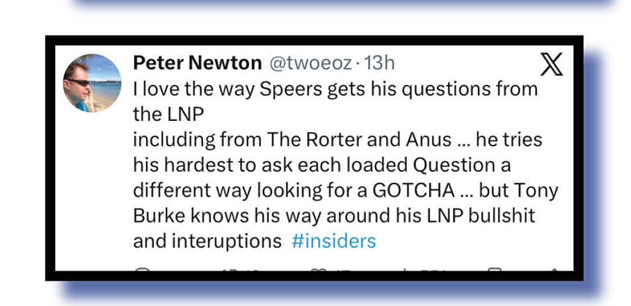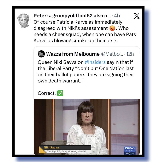 With more general observations of PK’s sit-down comedy efforts on Insiders, her battle with Niki Savva and David Speers’ handling of them both and his interview with Home Affairs Minister Tony Burke were Anthony Norman, Peter Newton, Glenn Gibson, Peter s grumpyoldfool 62, etc, and finally Tony Shepherd who maybe spotted something behind Karvalas’s outfit.