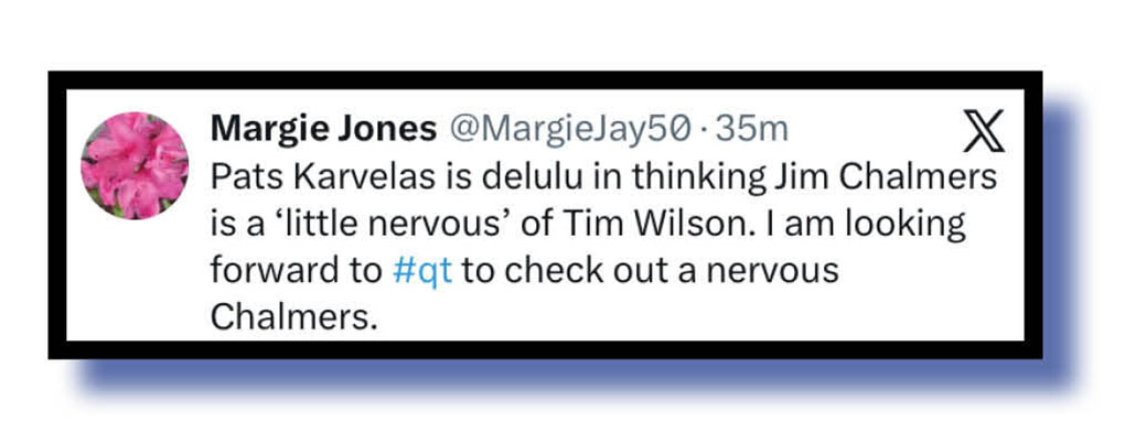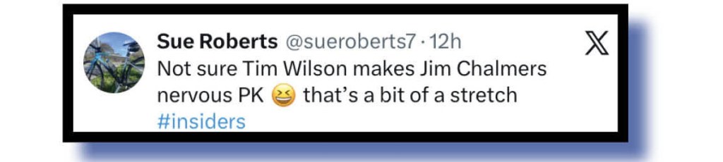 Now, to a comment on yesterday’s (Sunday’s) edition of the ABC Insiders program and an observation by Patricia Karvelas that Treasurer Jim Chalmers would be quite nervous at the prospect of his first debate with new Opposition shadow Treasurer Tim Wilson.
