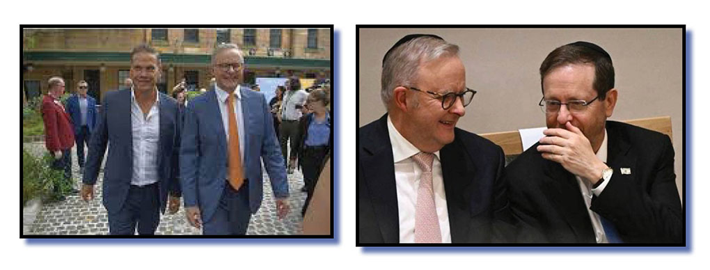 As this post was being prepared for uploading, the competing images (at top) – Albanese recently sucking up to genocidal mass murderer Israeli president Isaac Herzog and Albanese even more recently sucking up to Lachlan Murdoch – had garnered exactly equal support! 50-50!