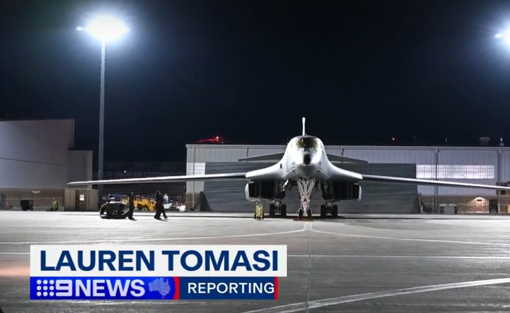 We’ll now move on to example two, where reporter Lauren Tomasi used the words “America’s heaviest artillery” to overlay vision of a US Air Force B1 bomber taking off to bring democracy and death, not necessarily in that order, to Iran.