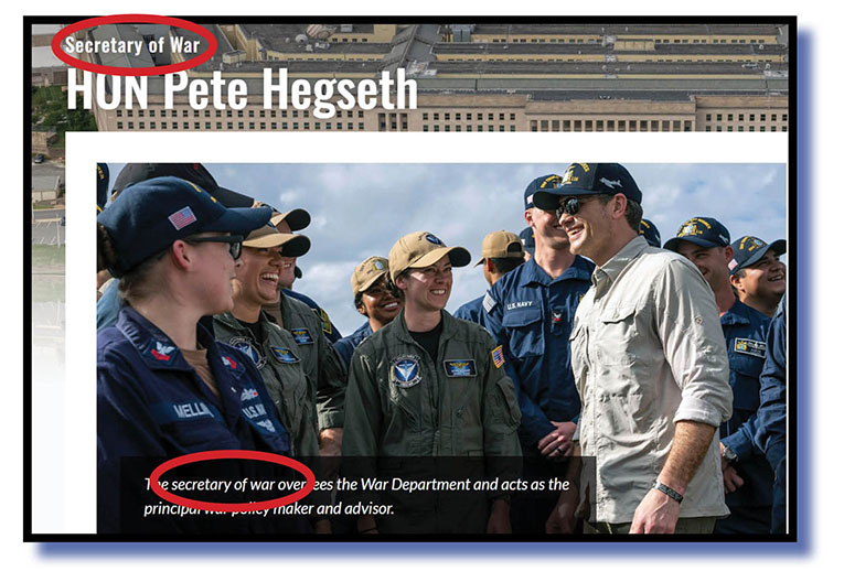Example 3 now. Last year, Seth Pisshead announced he was no longer the US secretary of defense (the US spelling) and was now the secretary of WAR! Signs and stationery were changed at great cost.