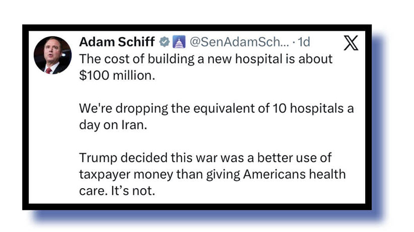 It may lack a punchy meme and is a rather poignant inner-American look at things as World War 3 looms, but our XOTW judges did like Adam Schiff’s offering (at top and below).