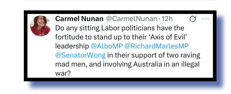 And now for youse BUGgers who have not identified the Down Under brown-noser mentioned in our heading at top, here are our favourite Witches, Charles Harvey, Carmel Nunan, Peter Murphy and Sunflower.